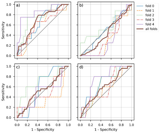 The AUC for pCR prediction averaged over the five models obtained via cross validation using only pre- and post-therapeutic T2w images as input was 0.68 (95% confidence interval [CI]: 0.59, 0.77). Combining pre- and post-therapeutic T2w, DW images, and ADC maps as input yielded an AUC of 0.43 (95% CI: 0.35, 0.52). Figure 3a and c depict the receiver operator characteristic (ROC) curves for each of the five models and the average over all folds.