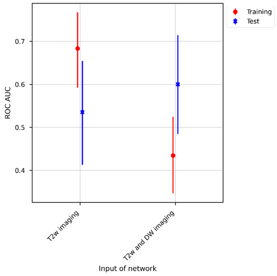 The area under the receiver operating characteristic curve (AUC) was calculated for the different receiver operating characteristic curves depicted in Figure 3. The AUCs are shown for the training (colored red) and test cohorts (colored blue). For the training cohort, classification with only T2w images as inputs performed significantly better than with T2w and DW images.