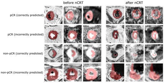 Examples of correctly and incorrectly classified patients. Each row shows input images of one patient before and after nCRT overlayed with the segmentation mask. Note the slight misalignment of the segmentation mask with the tumor region on the DW images, which might contribute to misclassification.