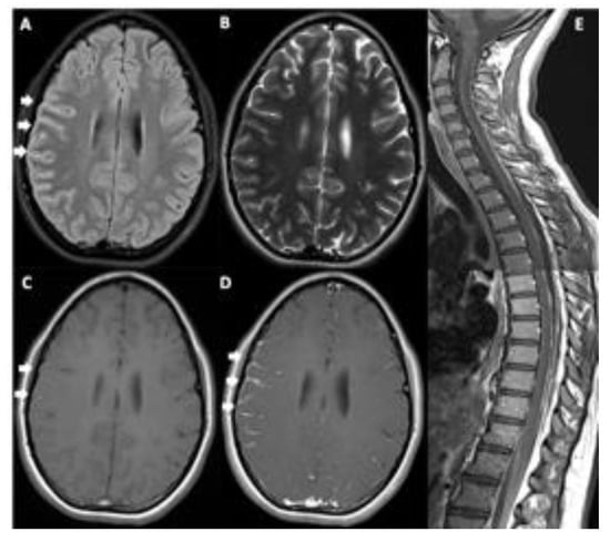 Brain MRI ((A–D), axial images) and spine ((E), sagittal Gd T1w image). Brain MRI shows diffuse leptomeningeal hyperintensity in the FLAIR image (arrows, (A)), not appreciable in the T2w image (B), with discontinuous mild spontaneous T1w hyperintensity (arrows, (C)) and diffuse leptomeningeal contrast-enhancement (Gd T1w, arrows, (D)). It is also appreciable diffuse spinal leptomeningeal contrast-enhancement (E).