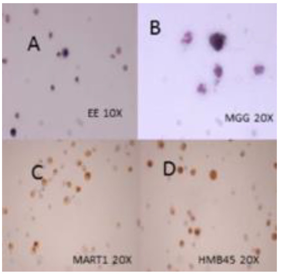 At cytological examination of the cerebrospinal fluid (CSF) stained with hematoxylin-eosin (A) and May–Grunwald–Giemsa (B) neoplastic cells with abundant pigmented cytoplasm, large vesicular nuclei and prominent nucleoli can be noted; immunocytochemical positivity for Mart1 (C) and HMB45 (D) confirms the hypothesis of melanoma.