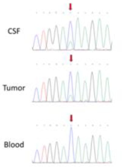 NRASQ61K mutation was detected by Sanger sequencing performed on DNA extracted from both tumor sample and CSF neoplastic cells. NRASQ61K is a hotspot mutation located in the GTP-binding region of the NRAS protein, conferring a loss of function as indicated by activation of downstream pathway signaling, increased survival, and transformation of cultured cells.