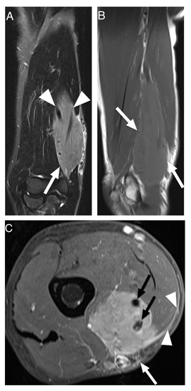 MRI of a 73-year-old man presenting with non-Hodgkin lymphoma manifestation in the flexor compartment of the upper arm. (A). Coronal T2-weighted TIRM image shows tumor of hyperintense signal intensity compared to muscle (arrow) and growth along the brachial neurovascular bundle (arrowheads). (B). Sagittal T1-weighted image shows long segmental involvement (arrows) and slightly hyperintense signal intensity of tumor in comparison to adjacent skeletal muscle. (C). Transversal contrast enhanced fat-saturated T1-weighted image shows homogenous contrast-enhancement of the lymphoma with encasement of the brachial neurovascular bundle (black arrows). Furthermore, subcutaneous stranding (white arrow) and contrast enhancement of the deep peripheral fascia (arrowheads) can be seen.