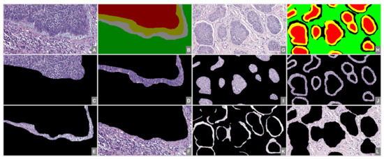 Using PMA.start’s API, which is free software offered by pathomation.com (accessed on 30 May 2022) [80], WSI images were brought into the MATLAB workspace and were segmented using the best performing network obtained in Section 2.2.3. The average time for segmenting a WSI was about 6 minutes on an Intel In(R) Silver 4216 CPU @ 2.10 GHz processor with 128 GB RAM and a Quadro RTX 6000 video adapter. A sample of two segmented WSIs is present in Figure 2.