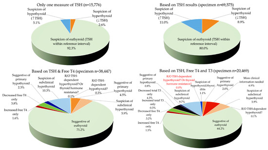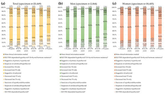 For 20,469 specimens with all three TFTs, the proportion of euthyroid decreased with an increasing age (Figure 4). The proportion of euthyroid was the highest in men aged 50–59 years, which was the predominant age group among men. The prevalence of specimens with “more clinical information needed” was higher in men (5.6%) than in women (3.6%).