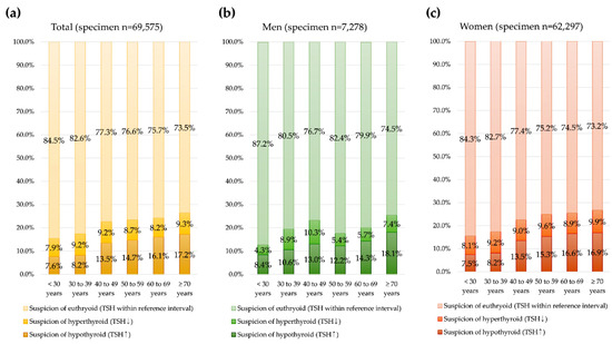 Prevalence of specimen thyroid function test (TFT) results among 20,469 specimens with all three TFTs by age group. (a) For total specimens, (b) men, and (c) women.