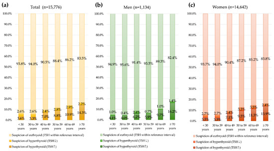 Specimen thyroid function test (TFT) results among 15,776 specimens with only one measure of TSH test by age group. (a) For total subjects, (b) men, and (c) women.