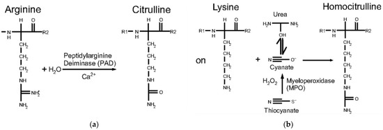 Citrullination (a) and carbamylation (b) occurring on different amino acids via different mechanisms but yielding similar end-products (Adapted from Shi et al., 2011 [2]).