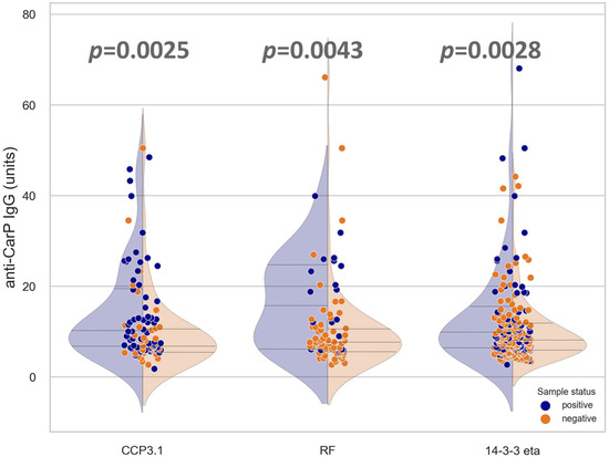 Anti-CarP antibodies were significantly higher and more frequent in anti-CCP3.1+ (p = 0.0025), RF+ (p = 0.0043), and 14-3-3 eta+ (p = 0.028) samples compared to the negative counterpart group (Figure 2).