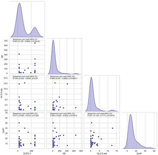 Correlation diagram between rheumatoid arthritis (RA)-associated markers anti-CarP, anti-CCP3.1, RF, and 14-3-3 eta. Spearman’s coefficients and p-values are indicated in the figure.
