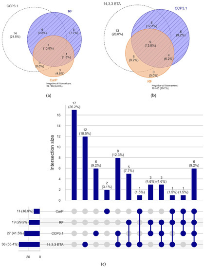 Overlap between anti-CCP3.1, RF, 14-3-3 eta, and anti-CarP antibodies. Panel (a) shows a Venn diagram of anti-CCP3.1, RF, and anti-CarP antibodies. Panel (b) shows a Venn diagram of anti-CCP3.1, RF, and 14-3-3 eta. Panel (c) illustrates the combination of the four markers using an UpSet plot.
