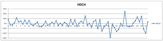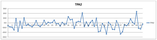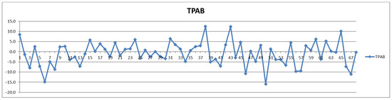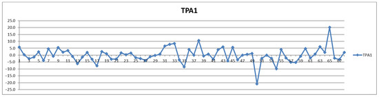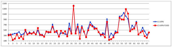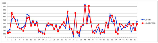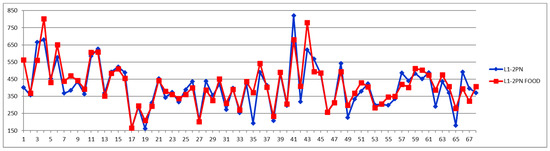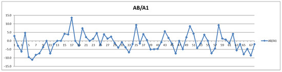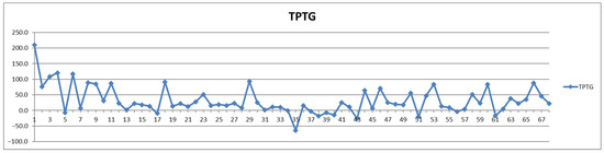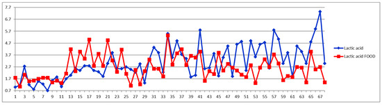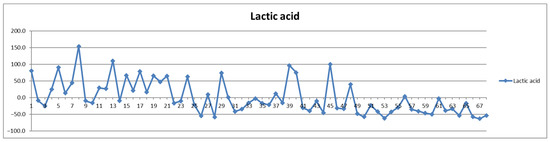 The second way of processing the results was as differences of concentrations between postprandial and fasting cases. Thus, in the Shewhart chart presented in Figure 2, each point represents the corresponding concentration difference between the postprandial (red) and fasting (blue) as a percentage relative to fasting status (considered 100%). One can see the general trend of the curve above 0% for the control group (cases 1–29) and below 0% for the CVD group (cases 30–68) representing increased and decreased Lac concentration after food intake for the two groups, respectively.