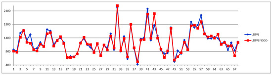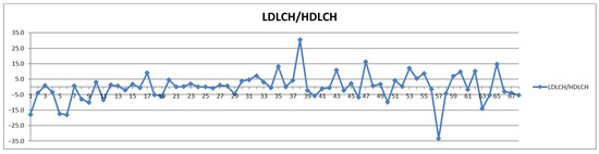 Although the border level of small-dense LDL particle number (L5PN + L6PN) for high CV risk is still under discussion, in general it is considered that a level between 100–600 nmol/L is of medium risk, while above 600 nmol/L is of high risk and above 900 nmol/L is of very high risk for CV accidents. Thus, lowering an already low level of s-LDL-PN is of no diagnosis significance. The question is if lowering a high-level s-LDL-PN could mislead the course of intervention in emergency CV units. For this, we examined the feeding effect on the total levels of s-LDL particle numbers, i.e., L5PN + L6PN (Figure 5). One observation from the Shewhart chart presented in Figure 5 is that with five exceptions (i.e., one CVD subject with cases 57 and 58 from different days, and three control cases 15, 26, 28) in all the other 63 cases, the s-LDL-PN concentrations are either diminished or almost unaffected by feeding. These five increased postprandial cases should be treated as exceptions, probably due to particular foods and/or very light meals. Out of the 63 cases for which the feeding is diminishing the s-LDL-PN level, there is only one case for which the feeding effect is misleading the diagnosis by shifting the result from high-risk to low-risk (case 30); all the other cases remain in the same class of risk. Nevertheless, this finding is supporting the concern that for cases close to the border between either high-to-very high or low-to-high levels, there might be a feeding-induced change of risk class. The answer to this concern should be a classical approach, namely that in all border cases a second sample should be collected in the fasting state in order to safely decide on patient management.