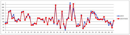 LDL cholesterol (LDCH) concentrations (mg/dL) in fasting (blue) and postprandial (red) status for control cases (1–29) and CVD cases (30–68).