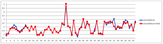LDL/HDL cholesterol ratios in fasting and postprandial status in fasting (blue) and postprandial (red) status for control cases (1–29) and CVD cases (30–68).