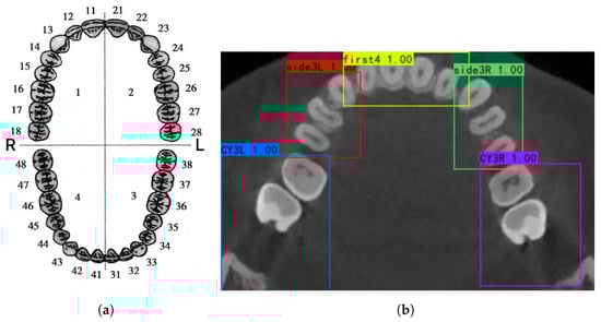 Another difference is in the bounding box. One tooth in one box often causes problems. Dentition with missing tooth or dental restorations with metal artefacts cannot be well detected, causing disorder of tooth bounding box labels. On the other hand, many teeth are similar in shape, so detection networks have low accuracy when distinguishing these teeth []. Here, we propose a combination of teeth detection and proportion-based division to generate each tooth’s bounding box. We detect five detected bounding boxes for each block. Figure 1b. In the detected bounding box, we locate the tooth bounding box based on proportion. According to Section Formula, a proportion located point inside a detected bounding box has a coordinate: