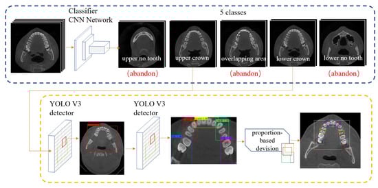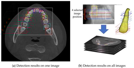 In conclusion, the whole teeth detection procedure is as follows: For each CBCT set, all images are classified into 5 categories in pre-process stage. From images in the upper crown area, we select the 10th and the last 10th image (images on red and blue lines in Figure 5b), the same for lower crown area. The selected four images are then sent into YOLO v3 detection network and detected main areas. In the main area, use YOLO again to detect five big boxes corresponding to five blocks. Then, we apply proportion-based division to get each tooth’s bounding box. Neighboring CBCT images share these tooth bounding boxes, as is shown in Figure 5b.