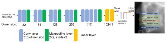 According to our task, we redesigned a mini-VGG model based on VGG in Figure 3. After the same experiment above, our mini-VGG model showed similar performance as VGG-16, while the training speed improved. This model receives a gray image with 128 × 128 size. The network uses random initialized weight; the loss function is a cross-entropy function for a common classification network []. The hyperparameters are the same as above. In the output stage, we extend three classes into five classes (illustrated above). The theory behind this is that we assume CBCT is scanned from bottom to top, so class labels change in order, e.g., when we observe the class label change from no tooth to crown, it means the layer label should change from lower no-tooth area to lower crown area.