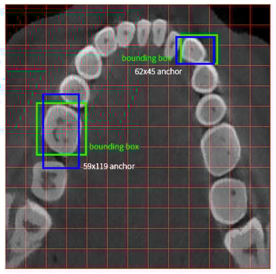In this stage, we apply teeth detection and divide each tooth by rectangle bounding boxes. Most researchers use two-stage detection networks (e.g., Faster R-CNN) and bounding boxes are labeled and trained per tooth [,,]. Our method makes a major difference to the detection network and detection bounding boxes. The first change is that we use the one-stage detection network YOLO v3 rather than a two-stage detection network. This network is seldom used in clinical CT detection because one-stage networks have lower accuracy on small object detection, and usually objects on CT are small. However, the YOLO-based network trains and predicts much faster than two-stage methods such as Faster R-CNN []. To improve performance, we use multi-level detection. (1) We detect the main area, a box bounding all teeth tightly; (2) we detect blocks of teeth as mentioned in Section 3. These objects are large enough according to the anchor size in Redmon J’s paper []. A comparison between a tooth detection box and middle size anchor box is shown in Figure 4.