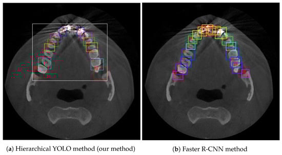 In an experiment, two detection methods separately detected teeth on each test set. Then, we compared the results of eight desired teeth with ground truth in the test set. The results are illustrated in Table 2. The results show there is no difference in mAP between our method and Faster R-CNN methods. (p = 0.835) There is a significant difference in Precision, Recall, and F1 between our method and Faster R-CNN methods. (p < 0.001, p = 0.034, p < 0.001).