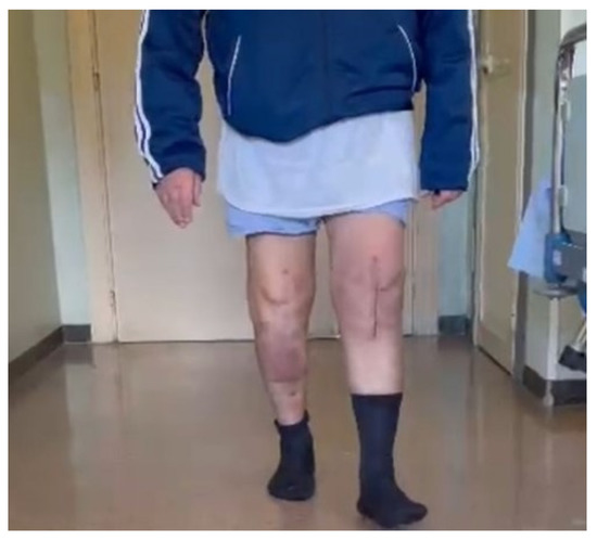 A 79-year-old man with a 10-year history of atrial fibrillation and arterial hypertension underwent TKA in September 2012 and left TKA in December 2013. The postoperative period was uneventful until September 2021. The patient was admitted to another hospital because of fever with shaking chill, increasing movement limitation, and swelling in the left knee, treated with empirical antibiotic therapy for two weeks. Our observation in December 2021 revealed extensive erythema and swelling at the surgical site and reduced range of motion with a knee extension deficit of 30 degrees. The patient was apyretic, but laboratory examination revealed an Erythrocyte Sedimentation Rate (ESR) of 87 mm/h and a C- Reactive Protein (CRP) level of 29 mg/L (normal < 5). Leukocyte and hemoglobin counts were normal. Knee joint aspiration was performed for laboratory and microbiological investigations, which showed an elevated WBC count (117.376 cells/μL) with high polymorphonuclear cells (91%) levels. In February 2022, the patient underwent a surgical procedure that consisted of accurate debridement, knee prosthesis removal (left knee), and an implant of a mobile spacer (a two-stage technique). We decided to implant a “metal on poly” mobile spacer, which consisted of a femoral prosthesis in titanium (cruciate retaining femoral component) and an ultra-congruent insert in polyethylene as described by Hofmann et al. in 1995 [22]. We administered teicoplanin (8 mg/kg body weight) based on our hospital protocol while awaiting culture results to ensure adequate coverage for methicillin-resistant Staphylococcus aureus. Cultures of intraoperative tissue samples yielded methicillin-susceptible Staphylococcus aureus. Intravenous antibiotic therapy was continued for two weeks without significant adverse effects, based on the outpatient parenteral antibiotic therapy (OPAT) model. Two weeks after the surgical procedure, intravenous antibiotic therapy was switched to oral treatment with Trimethoprim/Sulfamethoxazole 800/160 mg (thrice daily) and minocycline (100 mg twice a daily) for eight weeks. Two months after the surgery, the patient has fully recovered, as shown in Figure 1, for all motor functions. In addition to the standard PJIs’ management strategies, the patient underwent EBS procedures to verify their abilities in providing PJIs’ diagnostic and real-time monitoring functions.
