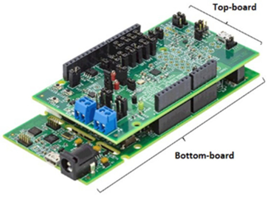 The measurement instrumentation used in the experiments was based on the microchip AD5940 by Analog Devices [23]. Indeed, the feasibility study was aimed at laying the groundwork for prototyping a wearable solution that can be integrated into a knee brace. Analog Devices provides two boards, namely EVAL-AD5940BIOZ (Top-board) and EVAL-ADICUP3029 (Bottom-board) to develop a custom firmware and test the microchip (Figure 2). The system applies a voltage settled by the operator (potentiometric configuration) in the range (10–750) mV. The maximum peak current is kept below IEC 60601 limits [24] by means of appropriate resistors and capacitors along the amperometric line. The EVAL-AD5940BIOZ is an Arduino platform, which hosts a microcontroller ultra-low power Arm Cortex-M3 to perform bio-electric measurements [23]. A 16-bit ADC with both 800 kSa/s and 1.6 MSa/s options and a voltage 12-bit DAC with output range of 0.2 V to 2.4 V and 200 kSa/s output are provided [24]. The bottom-board includes an integrated mixed-signal micro-controller systems, namely an ADuCM 3029 chip, which processes signals received by the up-board. Custom firmware was developed in the IAR Embedded Workbench Integrated Development Environment, and a user interface was realized in C-Sharp to allow the control of the bioimpedance meter. The instrument is connected to the PC through a USB port for power supply and data transmission. Bio-impedance measurements are implemented by means of a 4-wire configuration. A Digital Fourier Transform is performed by the AD5940 on the current and voltage measurements, respectively. Then the microcontroller uses the real and imaginary DFT results for current and voltage at specific frequency to calculate the unknown impedance.