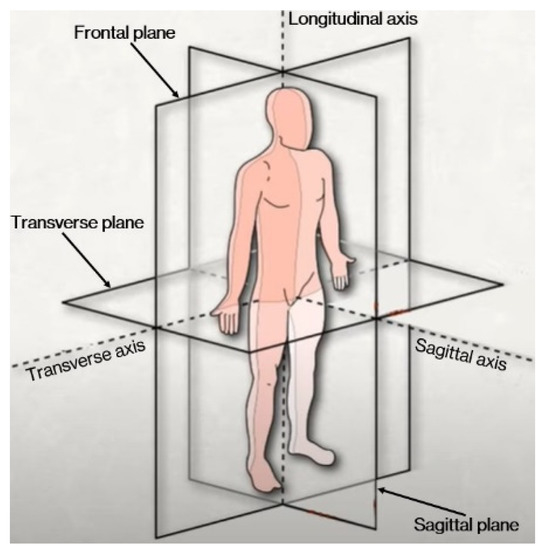 During the measurements, the impedance meter was connected to a laptop (set to battery power mode) for signal acquisition and all electronic devices were removed from the measurement zone. Before acquisitions, knee circumference, patella length and leg thickness above and below the patella were measured to exclude macroscopic asymmetries between the two knees, as reported in Table 1. The patient was subjected to three measurement cycles; namely: (i) before surgery, (ii) one week after surgery and (iii) one month after surgery. For each cycle, three measurements were realized at 100 frequencies evenly spaced from 100 Hz to 100 kHz on a logarithmic scale. Four FIAB 500 electrodes of 14 mm × 36 mm were placed on the knees as shown in the following. After the electrode positioning, the patient was asked to sit for the entire duration of the experiment. Tetrapolar impedance measurements are affected by peculiar uncertainty sources [25]. Nevertheless, the minimization of the impact of skin-electrode interface on the impedance measurement was assumed as the main goal to pursue. Indeed, by means of the tetrapolar setup, the voltage drop is only due to the current circulating subcutaneously. To make the experiment reproducible, a system of cartesian axes (transverse, sagittal, longitudinal) was defined as shown in Figure 3 and three planes were identified: sagittal, frontal and transverse. The position of the electrodes was identified through the choice of appropriate points in the defined space.