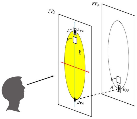 Two frontal planes (anterior and posterior) are defined in Figure 4. The planes identify the two planes tangent to the anterior and posterior surfaces of the knee. In Figure 4, the surface R is defined as the projection of the patella in the anterior frontal plane. The points AFA and BFA are identified as the intersection of the longitudinal axis with the R surface contour; the point BFP is identified as the orthogonal projection of the point BFA in the frontal posterior plane. Rear-front configuration (Figure 5A): A− is centered in AFA with the longer side parallel to the transverse axis and V− is placed 1 cm below. A+ is centered in BFP and V+ is placed 1 cm above. The measurements were realized for both the knees to compare the impedance variation from knee with healthy and infected prosthesis.