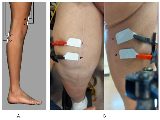 (A): Sagittal view of the leg model with electrode placement (B): actual electrode placement on the patient.