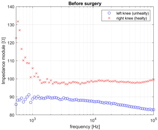 Impedance magnitude value for both right (healthy) and left (unhealthy) knee before surgery.