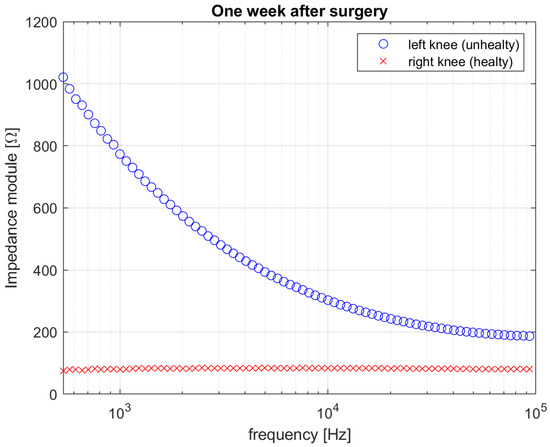 Impedance magnitude value for both right (healthy) and left (unhealthy) knee one week after surgery.