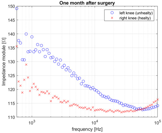 Figure 6 and Figure 7 show the results in terms of comparison between measured impedance magnitude in the rear–front electrodes configuration for both the two knees, acquired before the surgery, one week after the surgery and one month after the surgery, respectively.