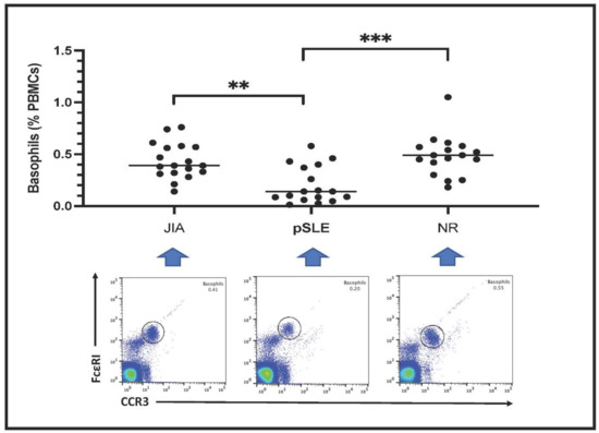 Circulating basophils are shown as FceRI+CCR3+ PBMCs in the plots included in Figure 1. Basophil count is expressed as percentage of total PBMCs. Notably, the number of circulating basophils in pSLE patients (0.20 ± 0.18%) was much lower than in children with JIA (0.43 ± 0.17%) or in those affected with non-rheumatic conditions (NR: 0.48 ± 0.20%); indeed, this difference among these groups was highly significant after statistical analysis (p = 0.0003).
