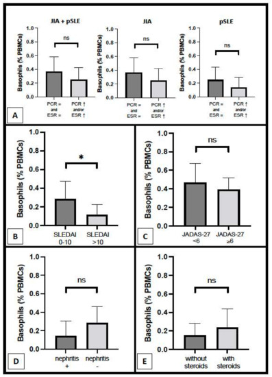 Basophil count according to several parameters, including inflammatory parameters ((A) pSLE + JIA combined groups, only JIA group, and only pSLE group), disease activity scores ((B) pSLE; (C) JIA), and, as regards pSLE patients specifically, renal involvement (D) and steroid therapy (E) (*: p < 0.05; ns: non-significant).