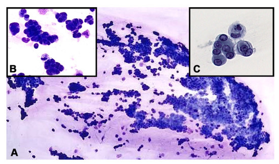 (A). Hypercellular vitreous fluid demonstrating sheets of cohesive malignant epithelioid cells (Diff-Quik stain. Original magnification ×100). Inset (B). Groups of tumor cells forming micropapilla-like structures (Diff-Quik preparation, ×400). Inset (C). Pap-stained smear depicting clusters of neoplastic epithelioid cells with eccentric nuclei and vacuolated cytoplasm (original magnification ×400).