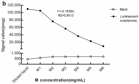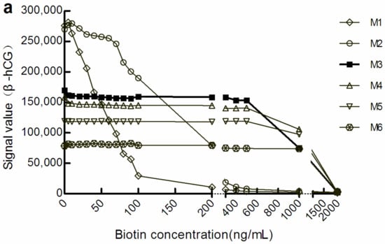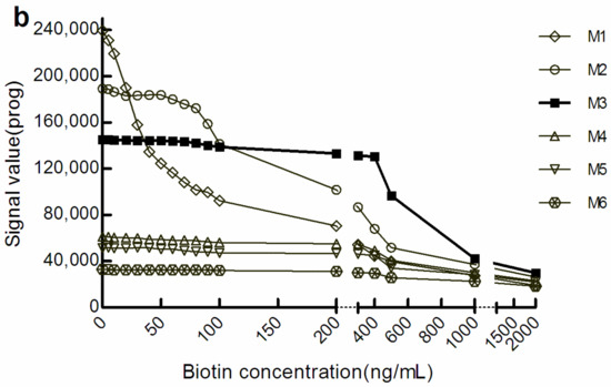 With the increase in M concentration, the light signal level gradually decreased. However, when the light signal tended to be stable, the biotin concentration range was increased in the corresponding sample. We defined a change in the amplitude of the optical signal value within ± 10% to be good anti-biotin interference ability. According to this standard, in the sandwich mode, the biotin concentrations that M1, M3, and M6 could resist were below 20 ng/mL, below 500 ng/mL, and below 1000 ng/mL, respectively (Figure 1a). There were similar manifestations in the competition law model, although the biotin concentration range differed somewhat (Figure 1b). However, the level of optical signal decreased with the increase in the concentration of M, which suggests that increasing M concentration may increase the shielding effect on the optical signal.