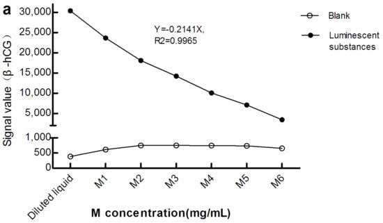 As seen in Figure 2, with greater M concentration, the light signals in the blank (The blank reaction system used Roche diluent as R1, R2, and the sample, and M1–M6 as the M reagent. The Roche diluent was without β-hCG/Prog) increased while that of the luminescent substances diminished. Therefore, there was a negative correlation between the light signal level of the luminescent substances and concentration of M. This suggests that, when the surface area of the electrode/magnet is fixed, with increasing M concentration, too many magnetic beads may be adsorbed in a stacked state.