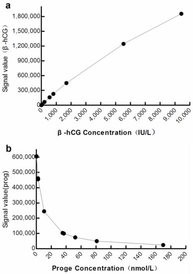 Curve showing correlation between the optical signal and analyte concentration at M3. (a) β-hCG: β-human chorionic gonadotropin; (b) Prog: Progesterone.