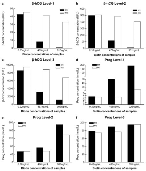 The concentrations of biotin in fresh serum samples were low before the addition of biotin solution, while after adding a 10% volume of biotin solution at different concentrations, the biotin concentrations in the serum samples reached approximately 500 ng/mL and 1000 ng/mL (Table S2). With the increase in the biotin concentration in the sample, compared with the detection results of M1 in samples without biotin addition, the range of variation in the detection results of β-hCG and progesterone with M1 was markedly greater than that with M3. This was true for all three biotin concentration levels. With M3, when the concentration of biotin in the sample was approximately 500 ng/mL, the detection results of β-hCG and progesterone differed by approximately 10% from those obtained with M1 in samples without biotin addition. However, with M3, when the biotin concentration in the samples was approximately 1000 ng/mL, there was more than 20% difference in the detection results of β-hCG and progesterone from the results of M1 without biotin addition (Figure 4a–e).