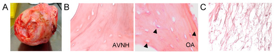 Samples of bone were isolated from the macroscopically affected areas of femoral head specimens (Figure 1A), sectioned in the coronal plane. Bone cylinders were extracted from the sample with the help of a trephine. These samples were preserved and subsequently used for the anatomopathological analyses. For preservation, the cylindrical biopsies were immediately placed in 10% neutral buffered formalin at room temperature for 24 h and subsequently decalcified in 10% ethylenediaminetetraacetic acid at room temperature following standard procedures [24,25]. Decalcified specimens were embedded in paraffin and paraffin sections (4 mm thick) were cut using conventional methods. Sections were stained with Mayer hematoxylin and eosin and Masson trichrome [15,16]. The total number of empty osteocyte lacunae was quantified by two unaware examiners in four non-overlapping regions of interest. At least 300 osteocyte lacunae were quantified in each specimen.