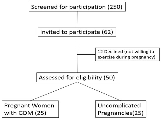 In this case, 250 pregnant women visiting consecutively the obstetric outpatient clinic of the Second Department of Obstetrics and Gynecology of Aristotle University of Thessaloniki for a regular follow-up of their pregnancy, were screened for participation in the study. Among them, 32 pregnant women were identified with GDM and were offered to participate in the study; 25 of the 32 agreed to participate in the study. Then 30 women with uncomplicated pregnancies (out of the 250 consecutively examined) were matched to the already recruited 25 GDM pregnancies regarding pre-pregnancy BMI, maternal age and gestational age and were asked to participate in the study. From them 25 agreed finally to participate in the study. Thus, 50 pregnant women agreed to participate in the study (25 with GDM and 25 with uncomplicated pregnancies) (Figure 1).
