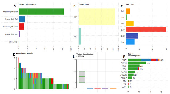 A graphical presentation of molecular findings. (A) comparison the mutation types with an evident dominance of missense mutation. (B) We noted the single nucleotide polymorphism as a main molecular aberration. (C) The cytosine-thymidine shift was observed to be the most frequent. (D) The graph presents several mutations in studied cases with emphasis on mutation variants. (E) Number of discovered mutations per case with a key role of missense type. (F) The variants according to gene. The PTEN gene presents a wide mutation landscape.