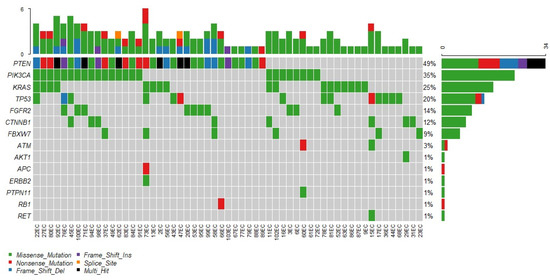 All results were analyzed in terms of quality. All nucleotides were covered with at least the minimum amount of reads necessary for reliable variant detection with the modified targeted capture-based approach in 67 cases. Thirty-seven cases were considered low-covered following the generally applied minimum read count for nucleotides in the targeted capture-based approach. These cases were excluded from the analysis. Generally, in the studied cohort, mutations in 14 analyzed genes were detected. Figure 1 depicts a characteristic of the mutational spectrum. Additionally the mutation spectrum according to histopathological type and grade is presented in Supplementary Material Table S4.