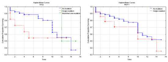 The majority of EC can be classified into one of the four molecular subgroups. However, in a small subset (3–5%) of patients, the molecular analysis will show more than one classifying alteration (e.g., POLEmut-MMRd EC, POLEmut-p53abn EC, MMRd-p53abn EC, or POLEmut-MMRd-p53abn EC). As there are distinct prognostic differences between the four molecular subgroups, the question arises as to which biological behavior these multiple classifiers follow. This dilemma is most pronounced in the combination of POLEmut-p53abn EC. The tumor exhibits a favorable pathogenic mutation in the POLE exonuclease domain and the unfavorable aberrant p53 IHC expression [15,20,21]. It seems that the proposed four-tiered classification will evolve in the future. In our cohort, we noted 28% MSI frequency with a dominance of MLH-1 silencing. Microsatellite instability, in general, affected RFS (p < 0.01), but MLH-1 aberration to tumor stage and grade (p < 0.01). According to the mixed molecular subgroups, our study showed a coincidence of MSI with TP53 mutation in four cases, which means that about 20% of MSI cases were additionally TP53 mutated. Imboden et al. reported a large cohort analysis in aspect POLE mutated EC. They reported a significant POLE mutation heterogeneity with hotspots in c.857C > G and c.1231G > C and better overall survival POLE-mutated patients [22]. We mentioned ten EC cases with negative mutation results. These may be only POLE-mutated, and this needs further testing.