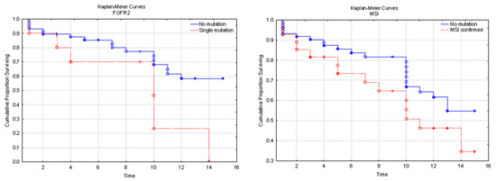 The statistical analysis did not reveal a clear dependence of mutation type with tumor grade, RFS, and OS (p > 0.05). One case of clear cell carcinoma presented no mutation in the user panel. Multivariate analysis showed the dependence of the tumor dedifferentiation with FGFR2 and TP53 (p < 0.01). Moreover, the FGFR2 mutation was more frequently observed in more advanced tumors (p < 0.01). We performed the analysis covering the number of SNP in aspect of RFS, OS, and age. The correlation was not statistically significant. However, the TNM strongly correlate with the TP53 SNP number (p < 0.01).