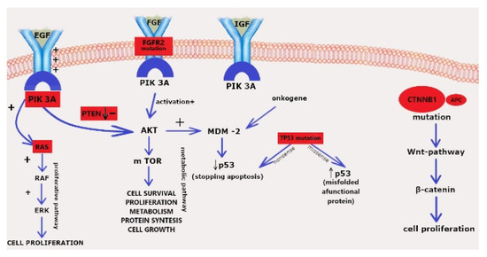 Many studies have identified PTEN mutation as the most frequent molecular event causing the initiation of intraepithelial neoplasia. Animal models of endometrial cancer have demonstrated that biallelic PTEN loss leads to the development of atypical hyperplasia, whereas biallelic PTEN loss, together with the PIK3CA mutation, leads to cancer. These findings confirmed the fact that PTEN mutation commonly co-occurs with PIK3CA and PIK3R1 mutation. A deep molecular insight into causative pathways allowed to separate the EC subgroups according to molecular pathway and clinical outcome. The first subgroup covers the POLE-mutated tumors. Patients in this subgroup presented the best disease-free survival (DFS). In the second subgroup are tumors which additionally presents microsatellite instability (MSI) or MLH1 promoter hypermethylation. The third subgroup includes low copy number (CNV)/and microsatellite stable (MSS) tumors with frequent CTNNB1 (Wnt-pathway) mutation. Finally, women in the fourth subgroup were characterized by high CNV via frequent TP53 mutation. In this subgroup, overall survival (OS) and DFS are poor [14].