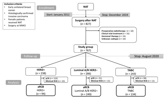 CONSORT diagram of the study population. Abbreviations: MMCI, Masaryk Memorial Cancer Institute; NAT, neoadjuvant therapy; TNBC, triple-negative breast cancer; HER2, human epidermal growth factor receptor 2; pCR, pathological complete response; aRCB, assessable residual cancer burden.