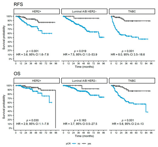 Kaplan–Meier curves of survival outcomes according to pCR achievement for each subtype. Abbreviations: pCR, pathological complete response; OS, overall survival; RFS, relapse-free survival; HR, hazard ratio; CI, confidence interval; TNBC, triple-negative breast cancer; HER2, human epidermal growth factor receptor 2.