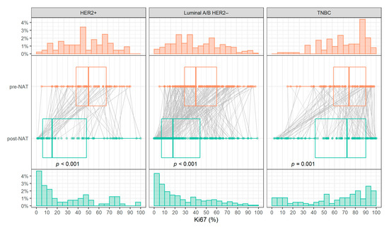 Histograms of Ki-67 pre- (top) and post-NAT (bottom) levels and comparison of Ki-67 levels (center). Abbreviations: TNBC, triple-negative breast cancer; HER2, human epidermal growth factor receptor 2; NAT, neoadjuvant treatment.