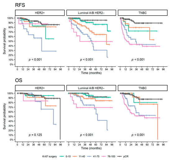 One of the key observations of our study was the different dynamics of KI-67 expression between the biopsy and surgical specimen among BC subtypes. To the best of our knowledge, the previously published studies evaluated the prognostic role of Ki-67 dynamics in terms of absolute or relative differences [45] concordance using categorical evaluation [46] or direction of change [47]. These approaches do not consider both the baseline levels of Ki-67 and their NAT-induced changes. Accordingly, it is desirable to consider pre-NAT, post-NAT, or both Ki-67 levels according to the specific BC subtype to evaluate further treatment options and prognosis. In TNBC patients with RCB, Ki-67 expression generally remained at the same level compared to biopsy, and, according to the multivariable analysis, post-NAT Ki-67 levels are preferred for prognosis assessment. On the other hand, Ki-67 expression was not significantly associated with long-term outcomes in HER2 positive patients, except for border significance of baseline Ki-67 levels for OS. The greatest importance of Ki-67 assessment was observed in luminal A/B HER2 negative subtype, in which the results of the multivariable analysis proved pre- and post-NAT Ki-67 expressions to be independent prognostic factors.